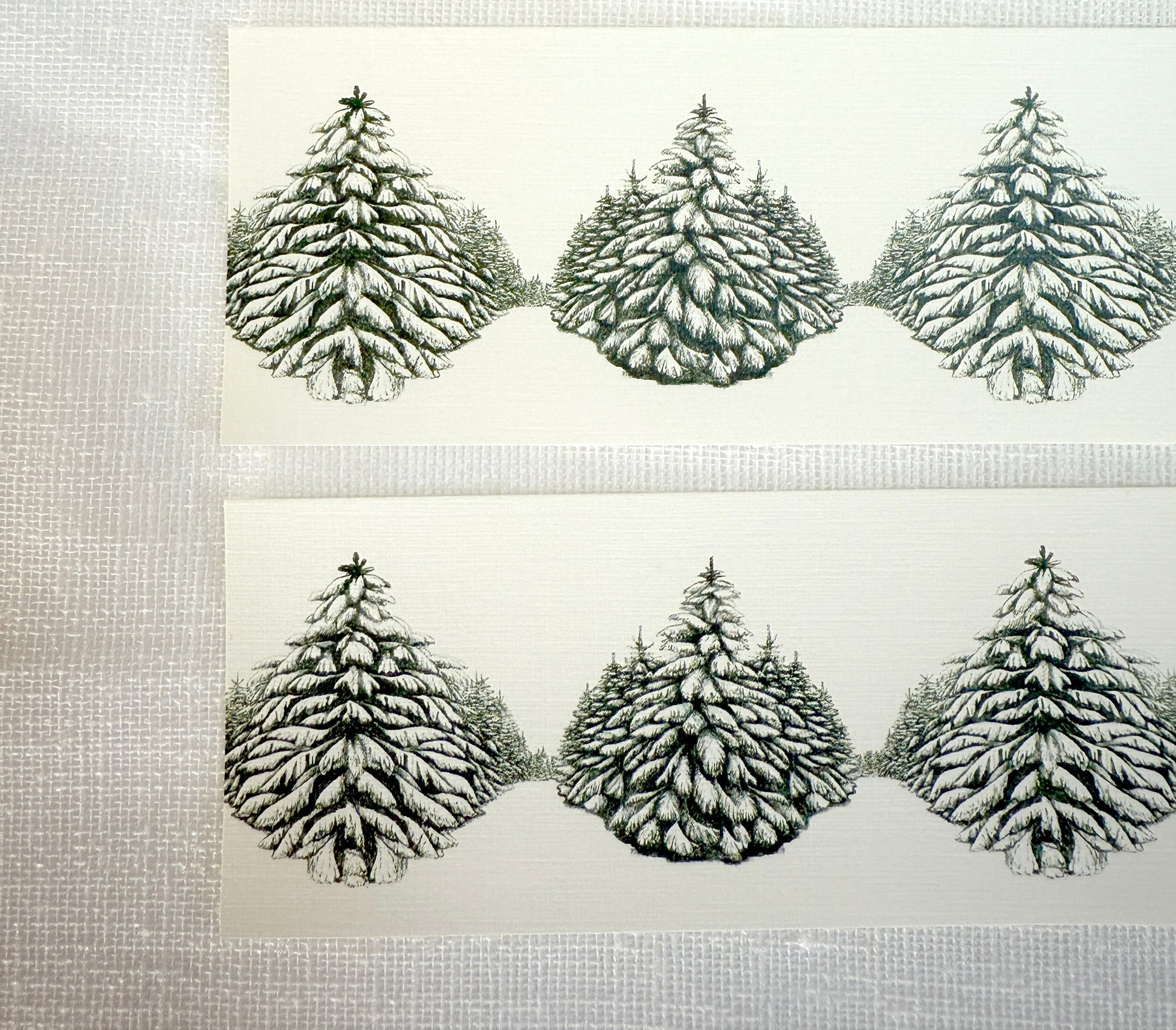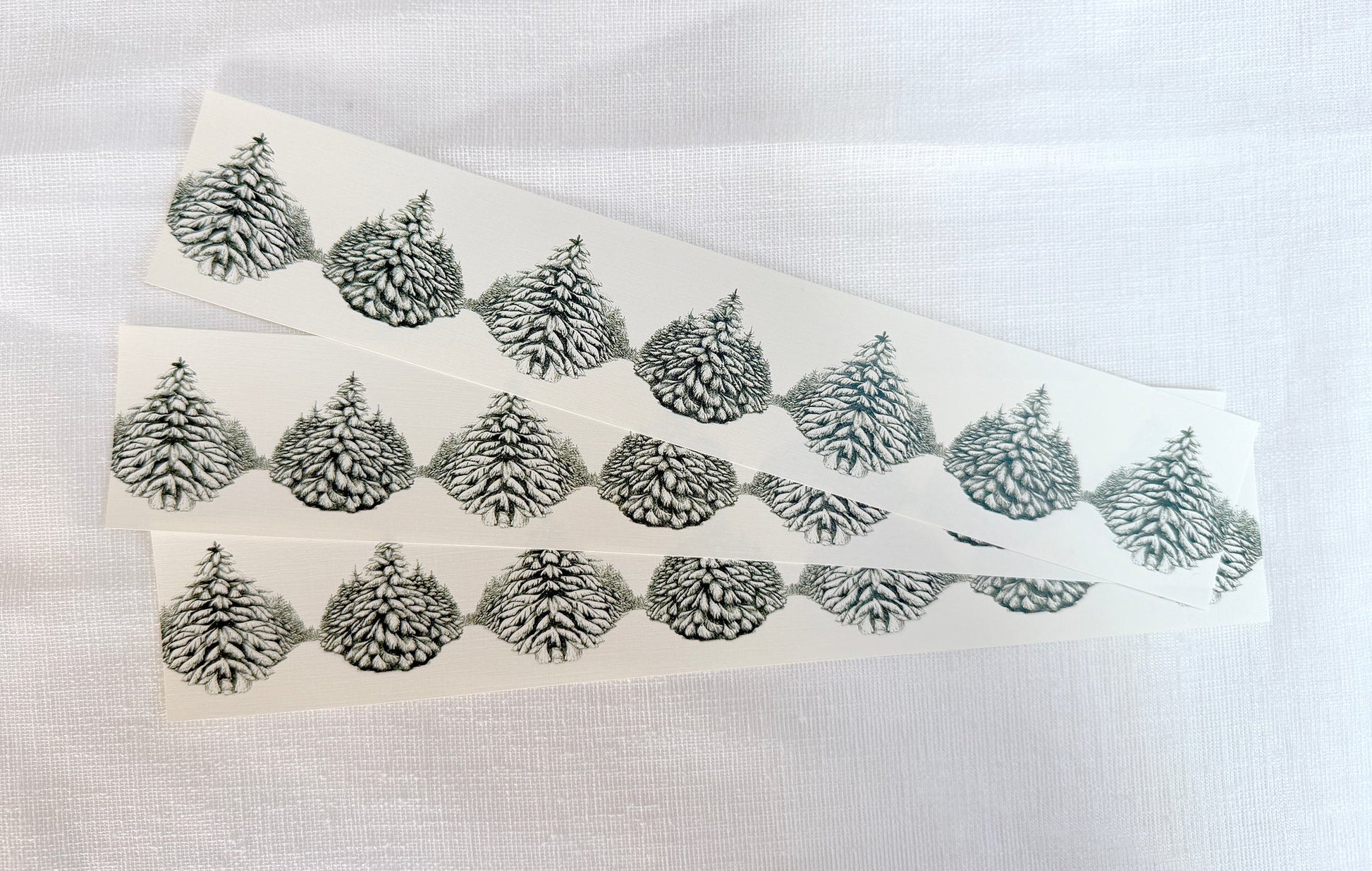 Evergreen trees dusted with snow bring cozy winter charm, making these napkin rings ideal for holiday gatherings.