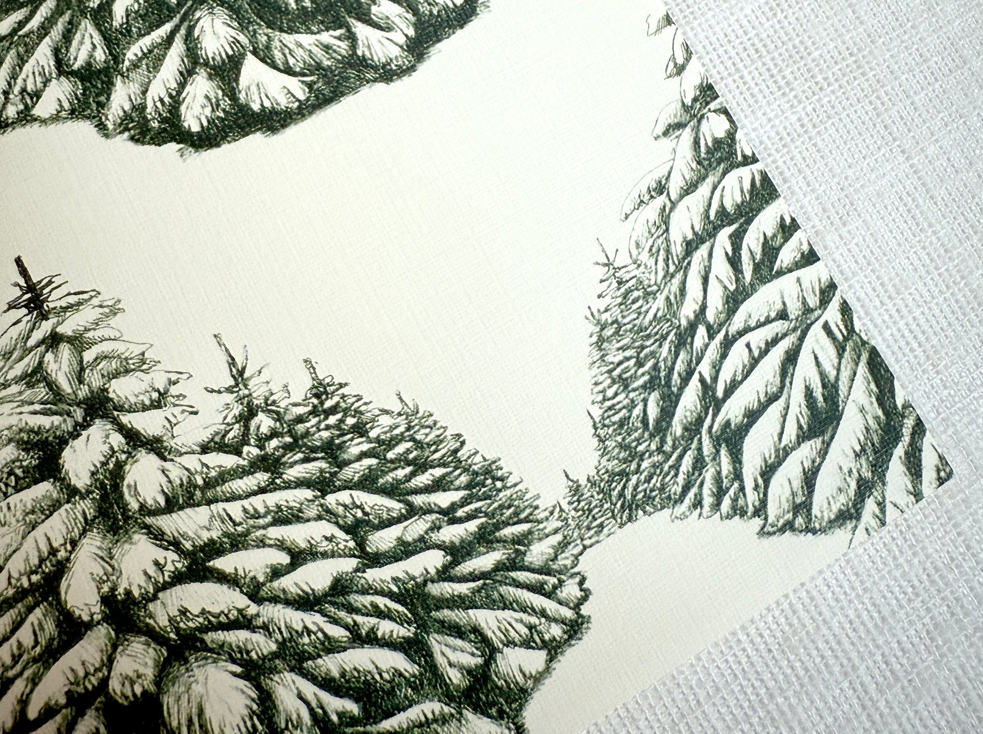 A festive winter design featuring hand-drawn evergreen trees blanketed in snow, creating a cozy seasonal table setting.