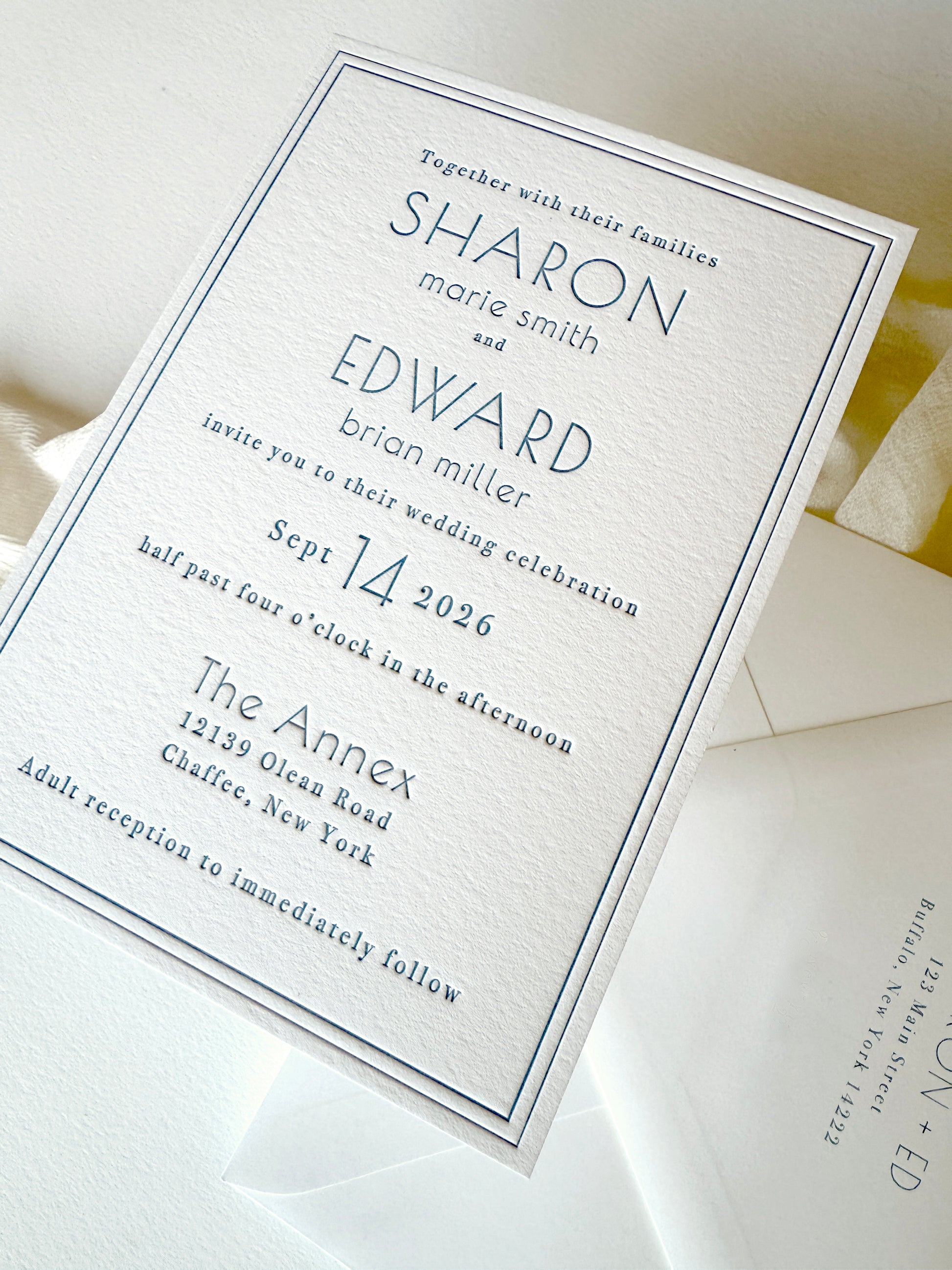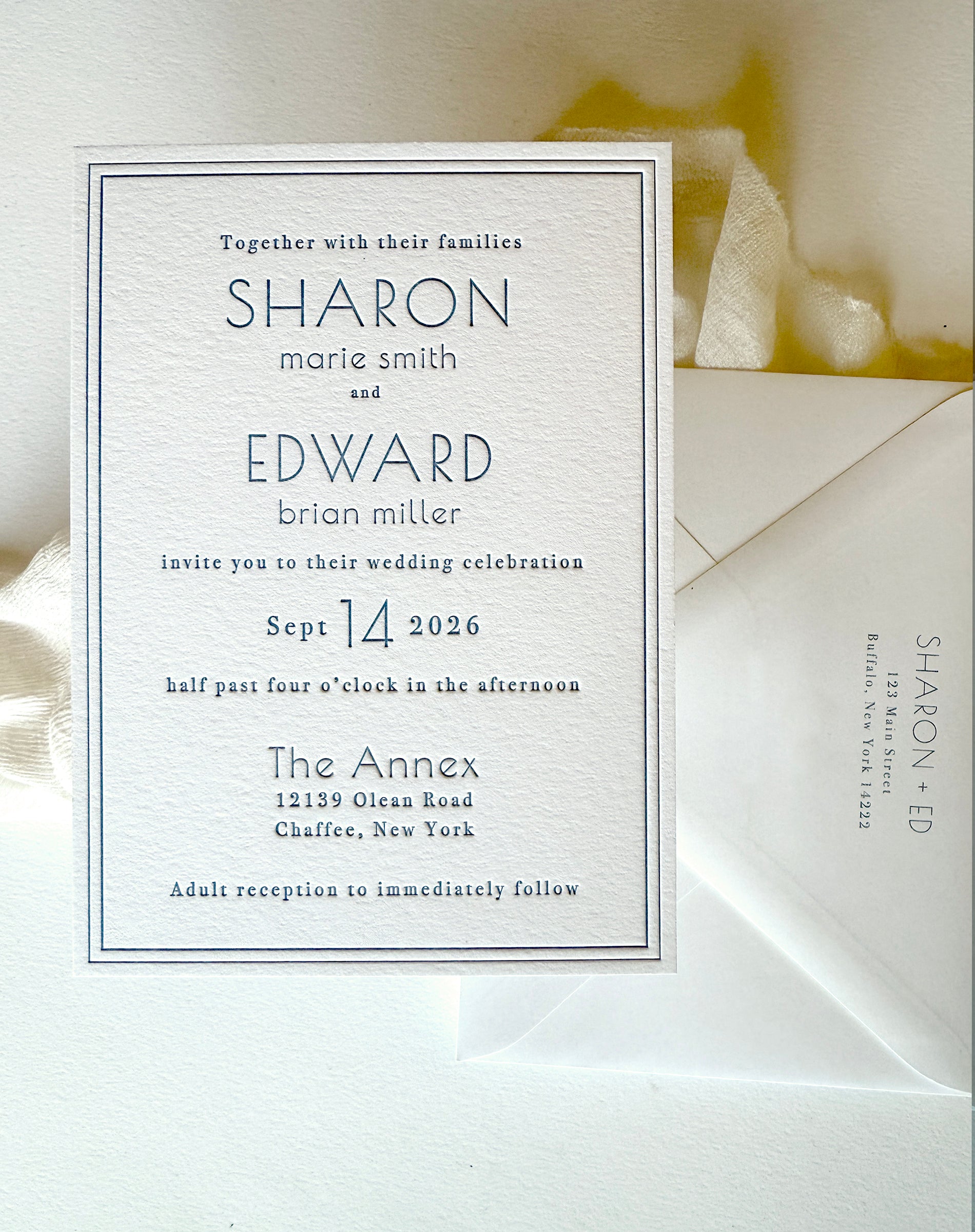 - Double-thick 5x7 invitation, one-color letterpress printed