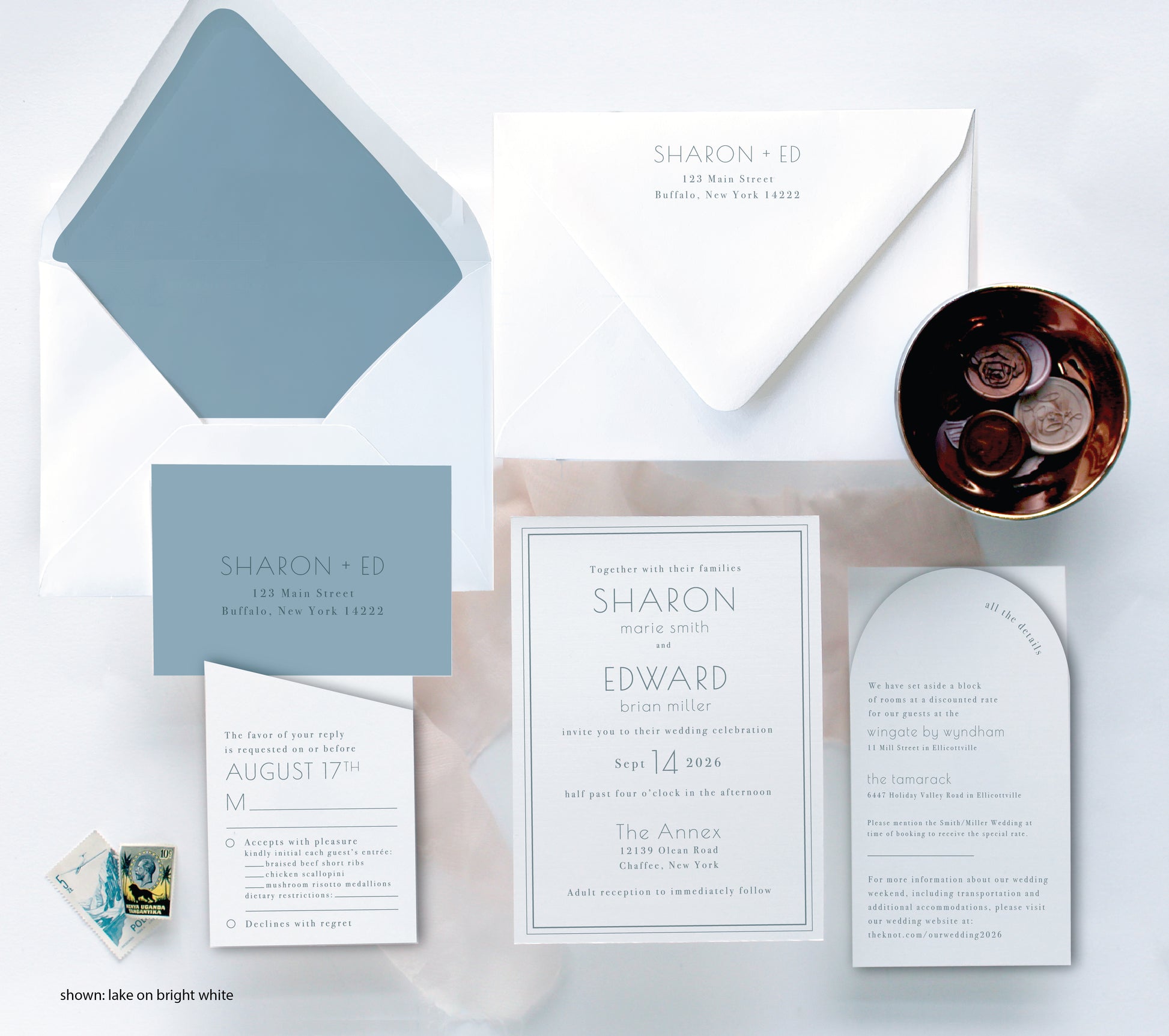 - Includes digital (flat) printed enclosure cards with the option to upgrade to letterpress printing