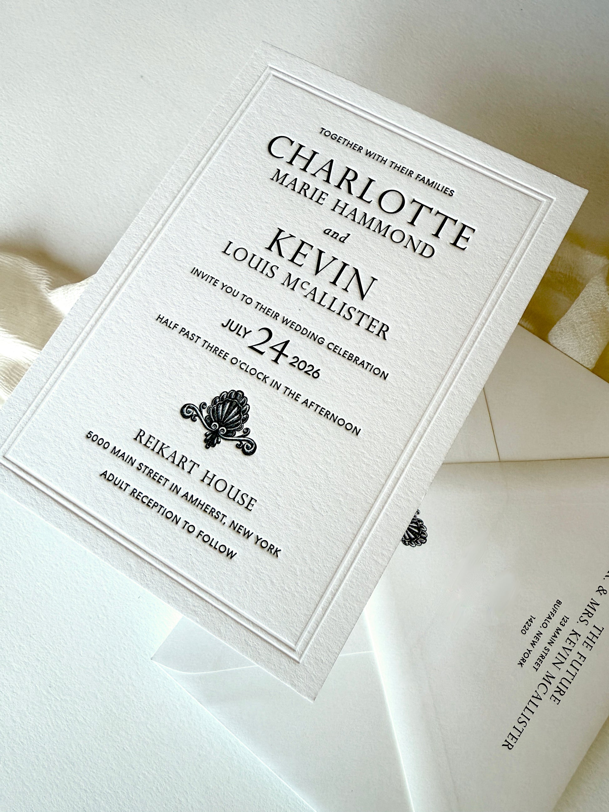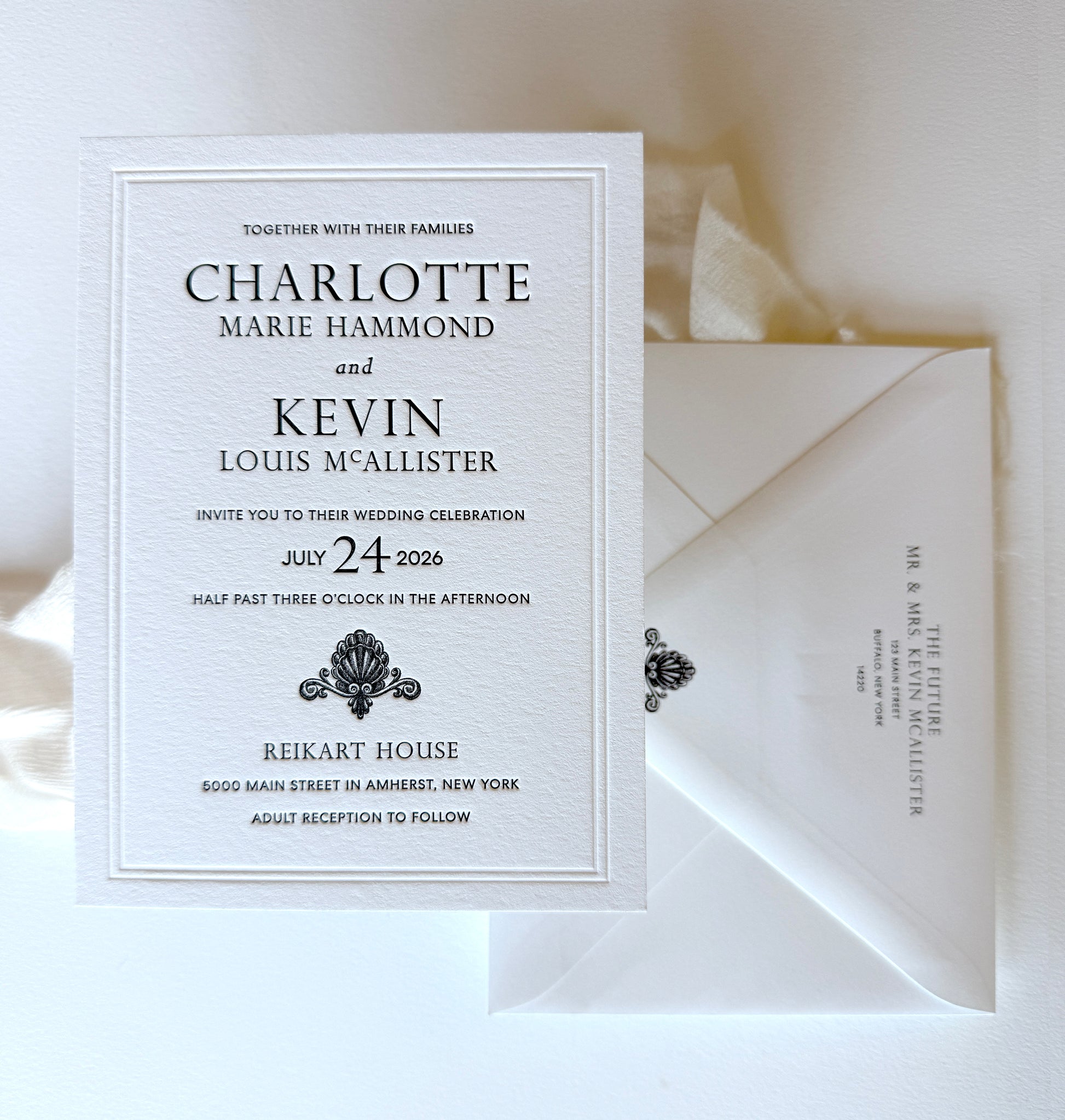 - Double-thick 5x7 invitation, one-color letterpress printed
