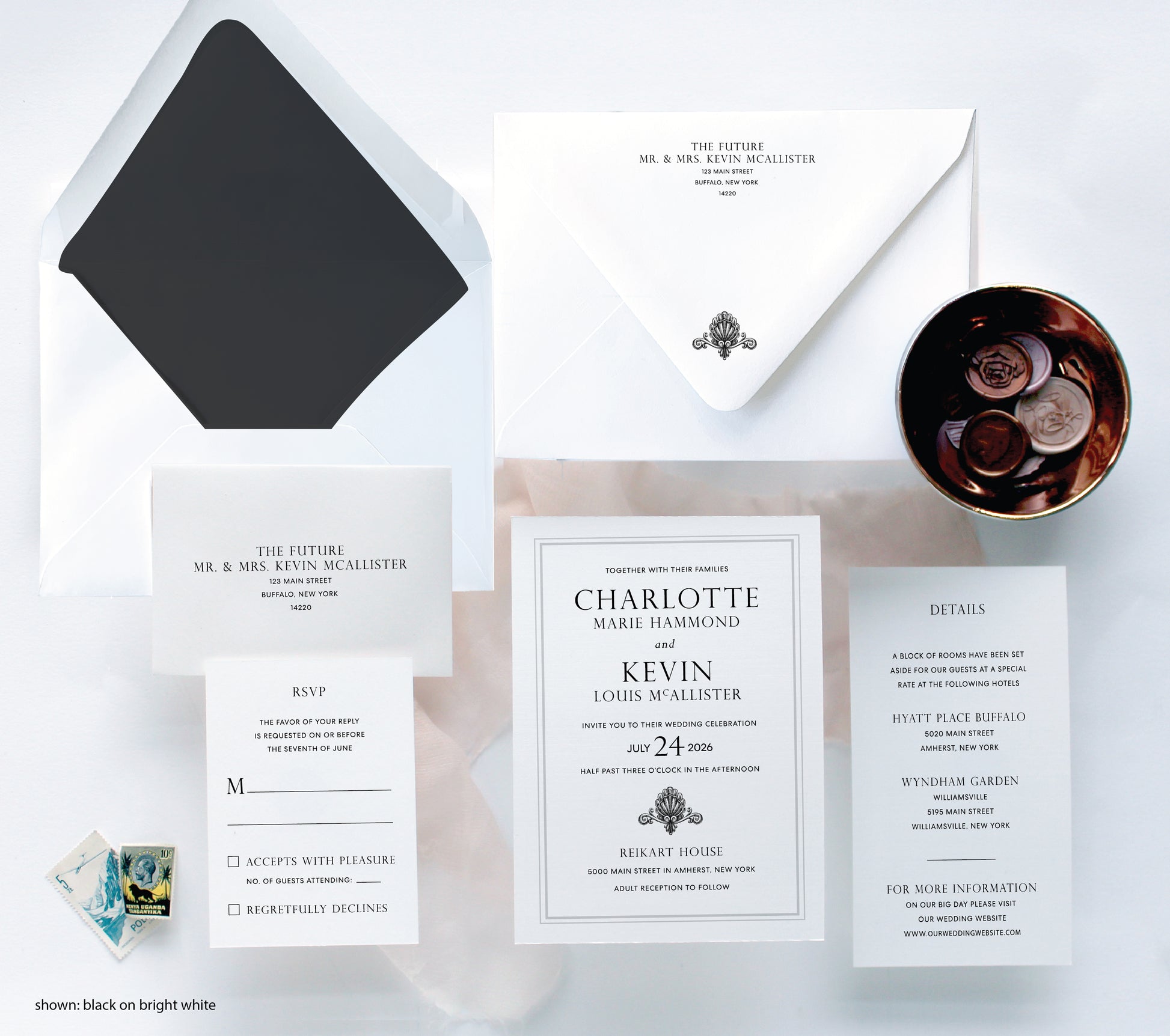 - Includes digital (flat) printed enclosure cards with the option to upgrade to letterpress printing