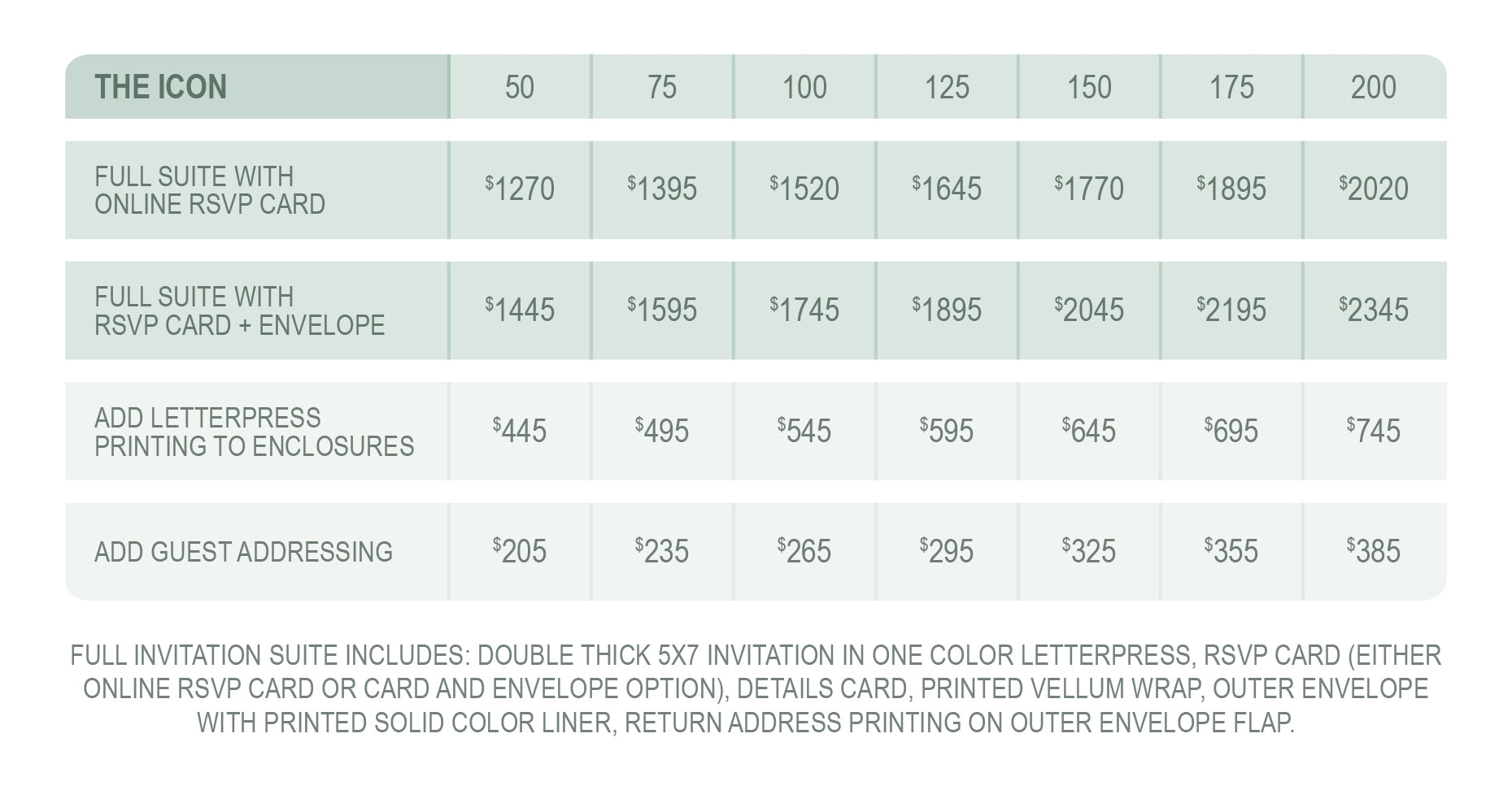 See the pricing chart posted above. Once this deposit is placed you will choose your options and add-ons (RSVP style, letterpress enclosures, and/or guest addressing). The invoice for the remaining balance will be sent after the final proof is approved to move the suite into production. (Don't forget - your quantity is one per household, not one per person! For example: a guest list of 200 people is usually around 125 invitations)