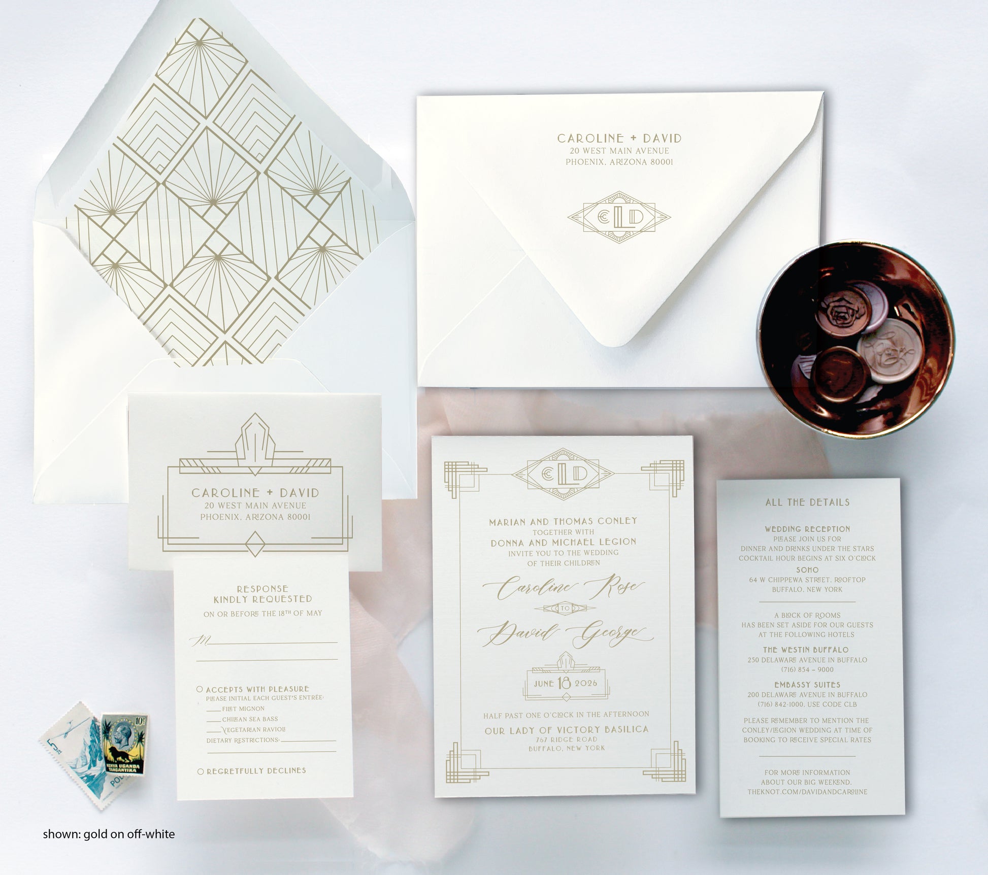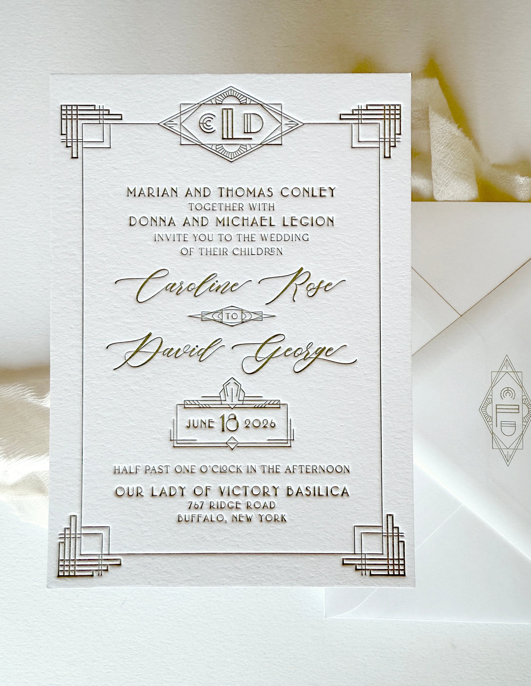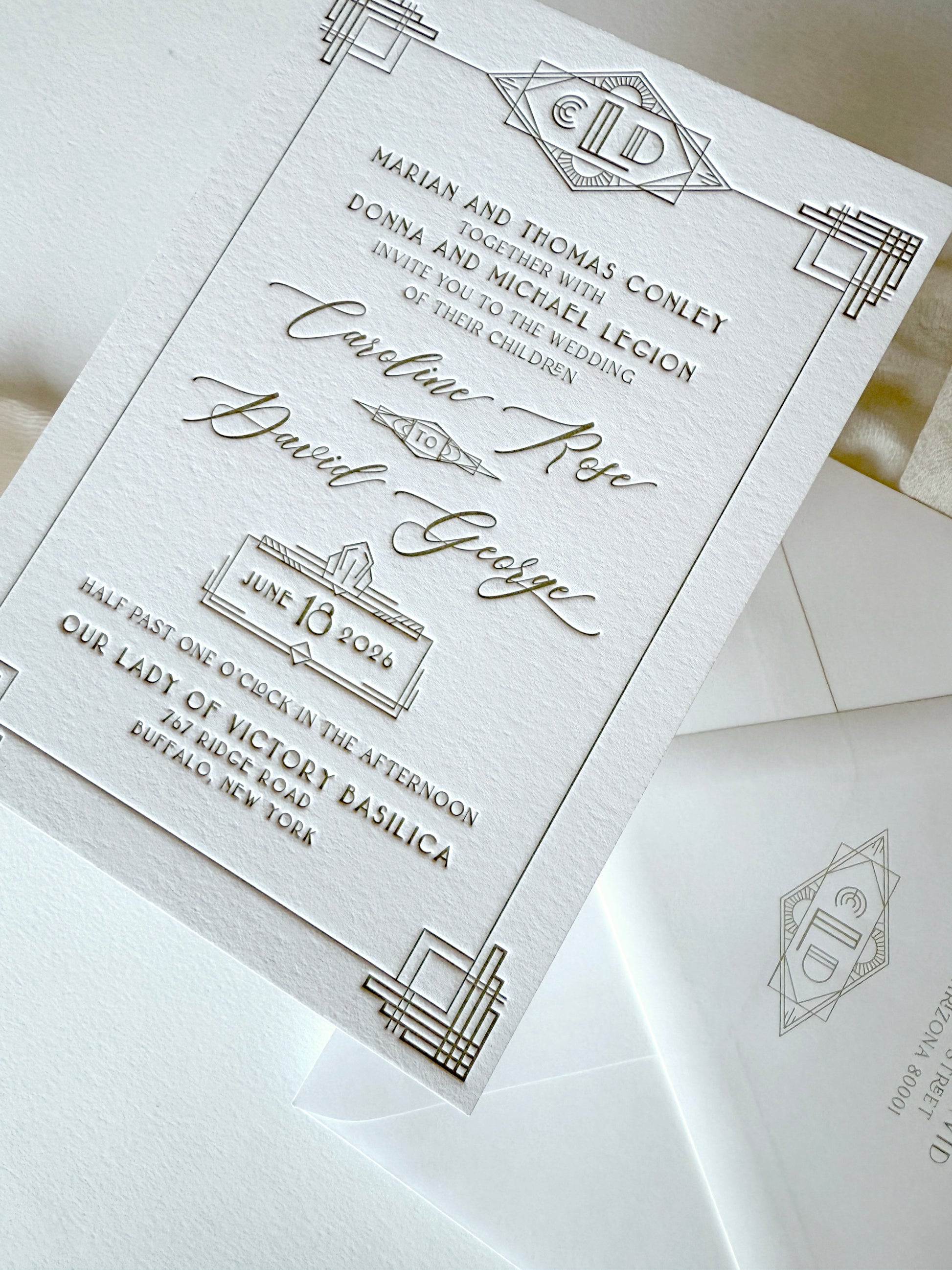 The Sinclaire Suite is a love letter to timeless design — elegant typography, thoughtful art deco design, and a balanced layout that feels both classic and current. Its simplicity allows the tactile beauty of double-thick letterpress printing to shine, creating a look that’s effortlessly graceful and endlessly sophisticated.