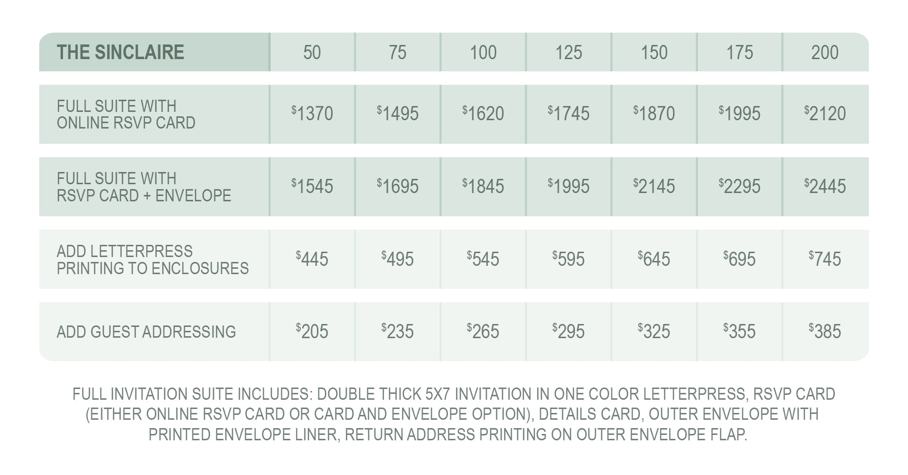 See the pricing chart posted above. Once this deposit is placed you will choose your options and add-ons (RSVP style, letterpress enclosures, and/or guest addressing). The invoice for the remaining balance will be sent after the final proof is approved to move the suite into production. (Don't forget - your quantity is one per household, not one per person! For example: a guest list of 200 people is usually around 125 invitations)