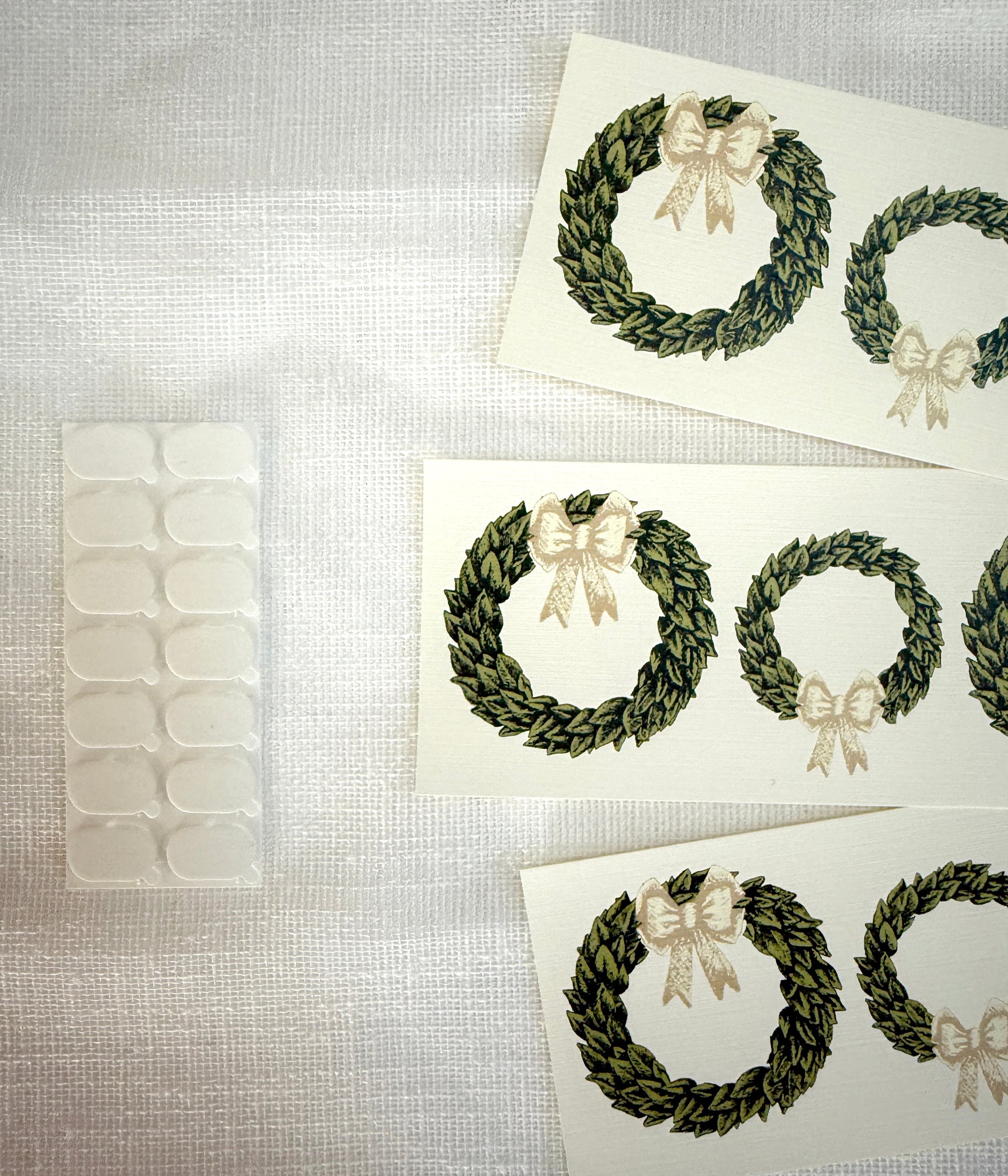 Hand-drawn evergreen wreaths tied with cream bows – an instant touch of holiday cheer for festive dining.